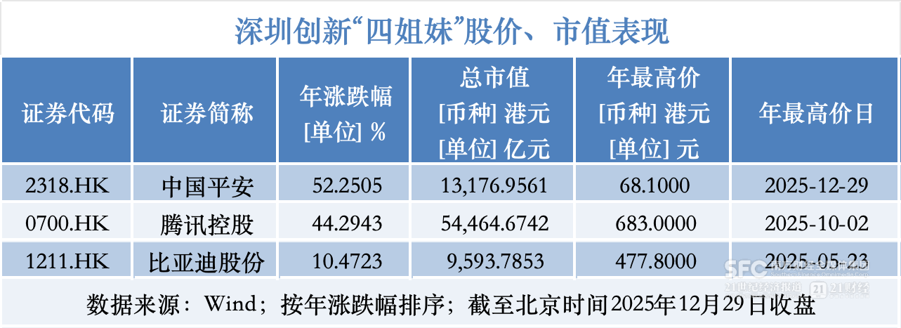 再看“深圳四姐妹”具体表现:除华为未上市外,其他三家公司港股年内全部录得上涨,中国平安与腾讯年涨幅均跑赢恒生指数与沪深300。其中,中国平安(2318.HK)截至12月29日收盘年涨幅52.25%,位居“四姐妹”之首;腾讯(0700.HK)年涨幅44.29%紧随其后;比亚迪(1211.HK)年涨幅10.47%。