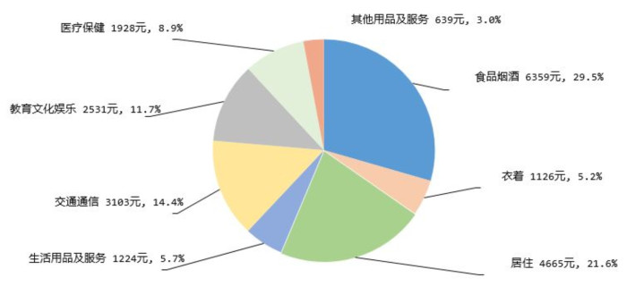 前三季度,全国居民人均食品烟酒消费支出6359元,增长2.5%,占人均消费支出的比重为29.5%;人均衣着消费支出1126元,增长1.6%,占人均消费支出的比重为5.2%;人均居住消费支出4665元,增长2.3%,占人均消费支出的比重为21.6%;人均生活用品及服务消费支出1224元,增长9.6%,占人均消费支出的比重为5.7%;人均交通通信消费支出3103元,增长8.3%,占人均消费支出的比重为14.4%;人均教育文化娱乐消费支出2531元,增长10.3%,占人均消费支出的比重为11.7%;人均医疗保健消费支出1928元,增长1.5%,占人均消费支出的比重为8.9%;人均其他用品及服务消费支出639元,增长10.3%,占人均消费支出的比重为3.0%。
